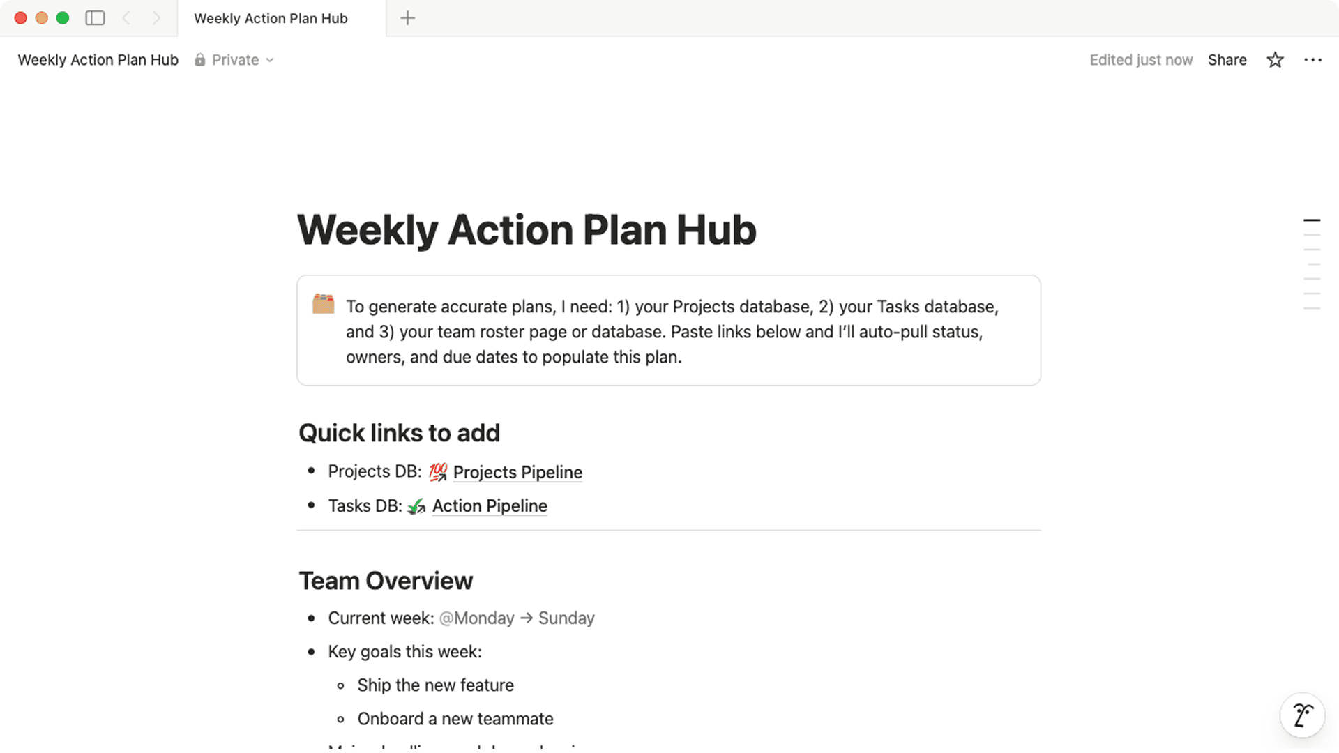 Let’s plan for the coming month using @Mode 1 (Essentialist Productivity Coach & Personal Assistant). By looking at my task database & projects database, emails, and meeting notes please do the following: - Assess & report: what should I focus on? What should I avoid? Why? - Identify the quick wins and deep work that will have the biggest impact for the month - Set a key goal for the month - Make a plan for the coming week - Set a task list ready for tomorrow and time block my day (you can then create or move relevant tasks in the tasks database to tomorrow and set their urgency and importance).